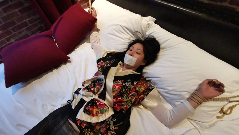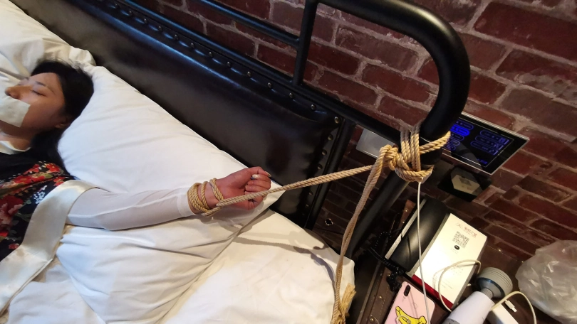 › 【JS】DM 日系性感睡衣 床上大字捆绑 撕袜 封嘴 DD强震