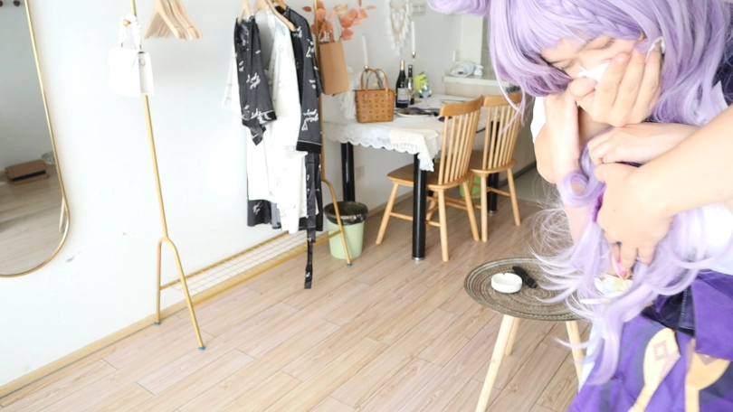 ,后来让coser姐姐坐在椅子上,小姐姐正在看着自己的衣服,心里特别美,