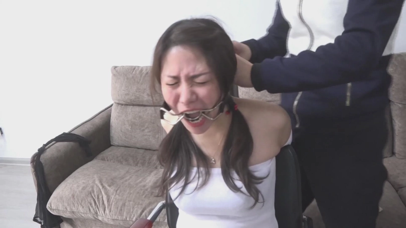 林静穿着性感的服装,被王老板捆绑。又被丝袜堵嘴、白布蒙嘴。挣扎无果之后,王老板又将林静绑成驷马,戴上了口环。并且又在面前放了一个搜集口水的盘子。口水搜集完之后,林静又被口球塞嘴。王老板过来,抚摸着林静的丝袜腿,并且当着林静的面,喝掉了刚刚搜集的口水。