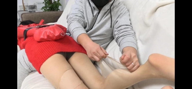 第二天柳洋还是穿着红色服装白色高跟鞋,这次穿了一双肤色丝袜,来到了学生家中。眼镜男子:“嘿嘿,老师你来啦,哦你先坐我去给你倒杯水。”柳洋也是坐在了电脑面前,突然看到电脑上的学习资料文件,柳洋就是为了给自己的学生补习而来的,所以得先看看自己的学生预备了哪些学习资料,结果一打开,柳洋吓了一跳一跳,这时候镜头拍摄电脑桌画面,原来这个文件没有任何的学习资料,里面全都是一些女孩被绳子捆绑起来的图片,而不知道为什么柳洋一张一张的看了起来,丝毫没有发觉自己的学生已经来到了房间中。眼镜男子将水杯放在柳洋面前,但是柳洋一点反应都没有,眼镜男子走到柳洋身后,趴在了椅子上,突然开口说:“老师,好看吗?”正在看着图片的柳洋被吓了一跳说:“你怎么回事啊,怎么走路没声音的。”眼镜男子说:“冤枉啊,我可是早就进来了,只是看老师看得高兴没打扰而已。”柳洋说:“难怪你成绩不行,原来你的心思都放在了这个上面,你告诉我那些图片是怎么回事。”眼镜男子:“那只是个人爱好而已,老师你不也看得很入迷吗?”柳洋撰着拳头就要打过来:“你还说。”眼镜男子一躲说:“怎么样,老师你要不要试一下。”柳洋:“我才不要。”眼镜男子:“老师你可是答应过我的哦,答应我一个条件。”柳洋犹豫了一下,不过最终还是答应了下来。两人来到客厅的沙发上,眼镜男子拿出一个单手套和几根皮带。柳洋好奇的说:“这是什么啊?”眼镜男子:“等一下你就知道了。”眼镜男子先将柳洋的套袖摘下来,然后慢慢给柳洋戴上单手套,随着单手套的带子一根根系紧,柳洋挣扎了一下说:“好紧啊,手动都动不了了。”眼镜男子没有理会,继续为柳洋穿戴单手套,穿戴好之后,在用一根皮带将柳洋的脚腕捆好。随后男子让柳洋趴在自己膝盖上,用手拍打柳洋的臀部说:“让你不听话,平时总是批评我,这下该好好的惩罚惩罚你。”拍打一会之后,眼镜男子来回抚摸柳洋的腿部突然说:“诶老师,你的丝袜好像破了一个洞哎,既然都已经坏了,那我就在帮帮你。”然后从大腿部慢慢撕烂丝袜,露出柳洋的赤足,但不要脱掉。眼镜男子抓着柳洋的赤足说:“老师你的脚真好看,就是不知道敏不敏感。”然后抓起柳洋的脚挠起了痒痒,眼镜男子看了看时间说:“哎哟,这么快就该吃饭了,嘿嘿,老师你等一下,我先去买饭。”然后将柳洋重新捆好,让柳洋平躺在地上。做好之后男子说:“老师你要听话乖乖的等我回来哦。”然后留下柳洋,柳洋躺在地上来回挣扎,慢慢移动到房门边,然后躺在地上伸出自己的双腿想要搭在扶手上将门打开,尝试几次之后终于够到了扶手。不过就在这个时候,眼镜男子回来了。看到在门边的柳洋男子生气的说:“老师你不听话哦,居然趁我出去的时候想要跑。”随后男子将柳洋重新抱回了沙发上。