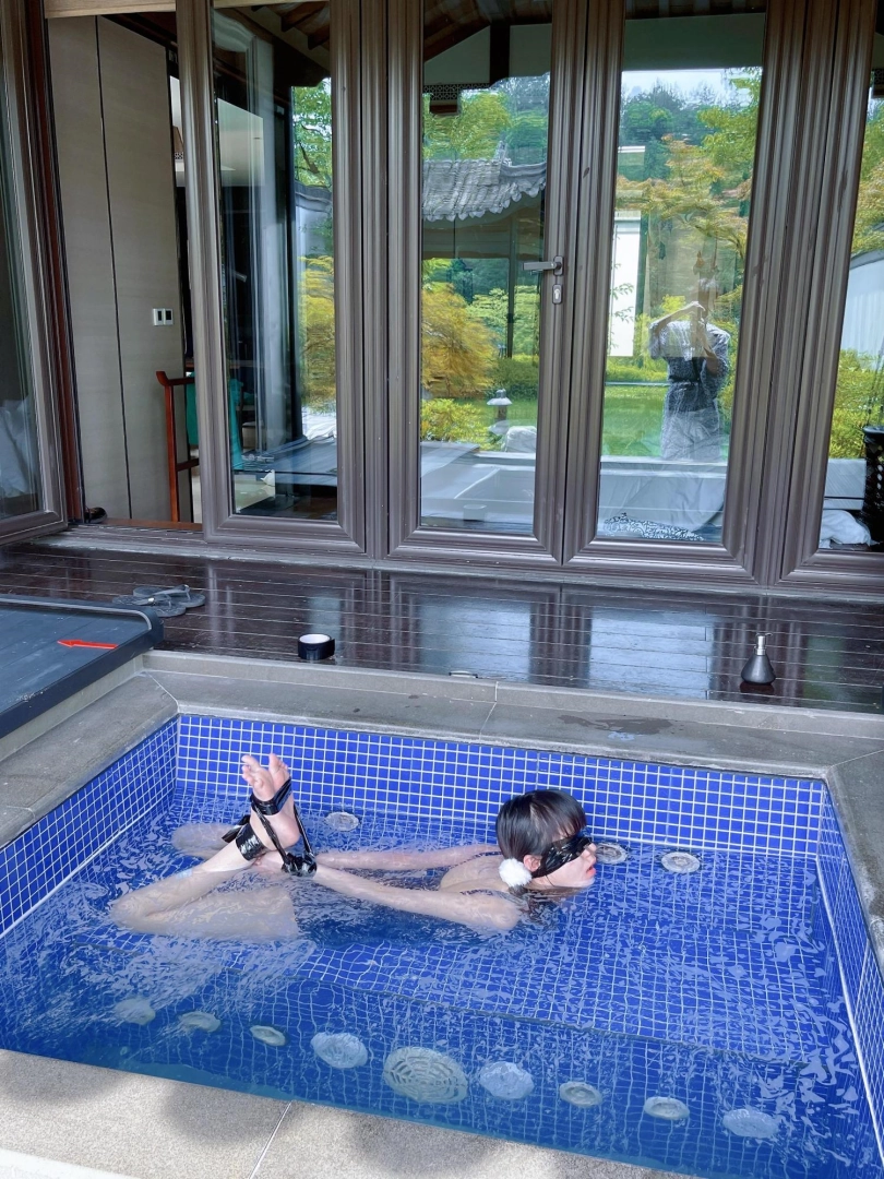 谁能想到,泡池盖子下面是一个娇小可爱的双马尾死库水美少女被驷马绑住呢~
