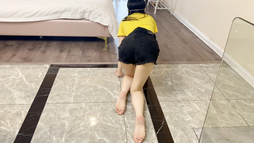 让可心裸足跪在卧室地上命令可心跪着爬到鞋架把杏色凉鞋拿起来放在地上,然后拿起两只凉鞋爬回卧室。