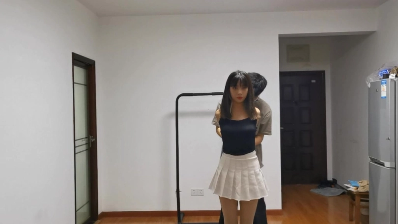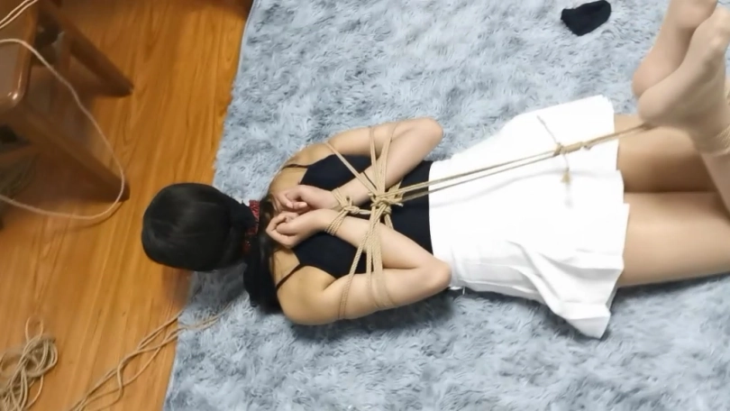 2.模特用装有一把钥匙的短丝袜塞嘴,然后用普通口球勒紧在丝袜外边,上身后手观音驷马捆绑,并胶带蒙眼,在地毯上随机位置再丢一把钥匙。目标在10分钟时间内用手拿到两把钥匙。