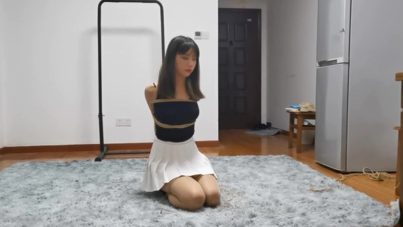 1.模特在丝袜外穿两双棉袜,上身直臂紧缚,双腿折叠捆绑鸭子坐,膝盖处将双腿并拢捆绑,用绳子将胸前的绳结连接到膝盖处,拉紧使其弯腰。目标在10分钟时间里脱下两只袜子。