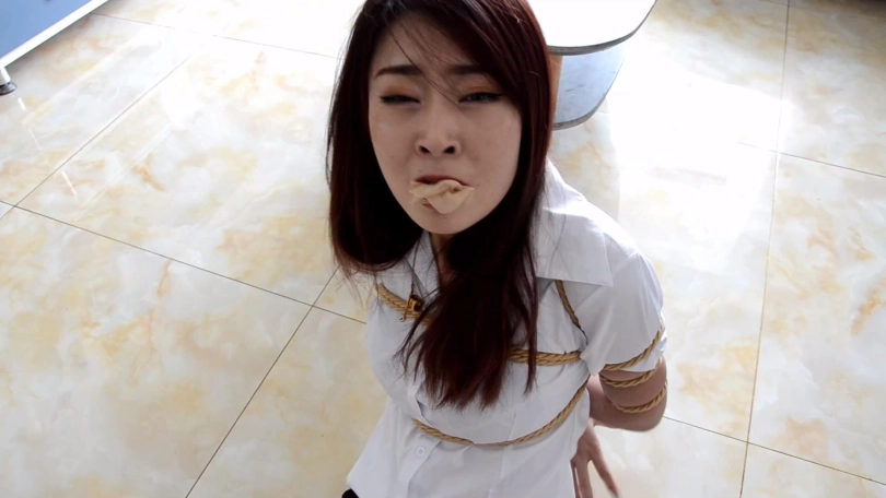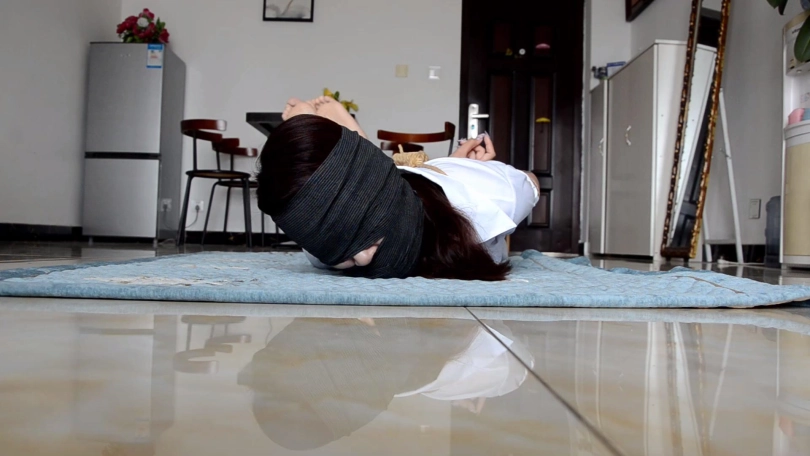 独自在家的女孩(瑾萱饰)在家遭遇歹人抢劫,歹人将女孩上身五花大绑后捆绑其双腿和脚踝,拽出女孩口中塞口球,强行塞入从女孩脚上扒掉的两只肉色短丝袜。