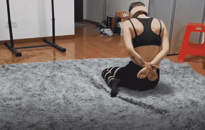 体育老师晓瑜,黑色运动装,手被交叉绑到背后再绑到腰上,双腿被绑成m形,无法站立,双眼被蒙住,只能在房间内无助的挣扎,捆绑方法很简单却几乎没有挣脱可能,即便身为体育老师也无可奈何