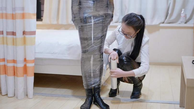 故事紧接上集,奴隶上门报复后,把她的钱也偷走了,于是女S又把他抓了回来,戴上单手套,用鞭子抽打,用保鲜膜包裹,用塑料袋……