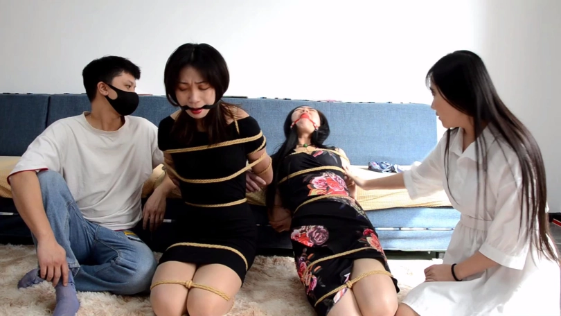 小雨说送姐妹二人点礼物,拽出姐妹二人口中塞口球后,与男友配合分别把两条丝巾塞入姐妹二人口中,而后与男友到卧室收拾东西准备跑路。