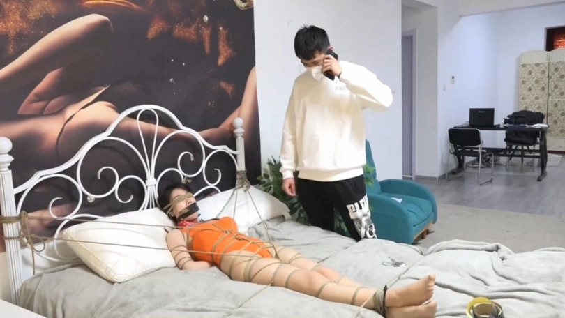 卧室里,男人正在有条不紊地把RF绑在床上。