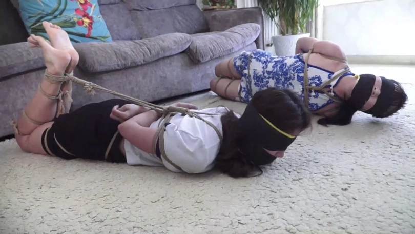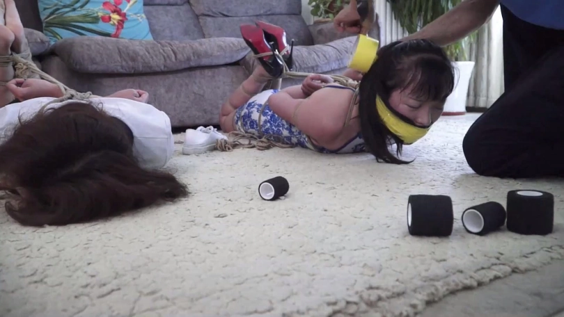 在二女一筹莫展之际锁哥得意洋洋出来,说我捆绑手法不错吧,你们没那么容易挣脱开,现在还有点时间还玩吗,二女拼命摇头表示放弃希望锁哥解开,可锁哥哈哈一笑说你们不想玩了,我还没玩够呢!锁哥将二女捆成驷马放置在沙发前地上,并表示打赌游戏二女输了,就得接受自己的惩罚。