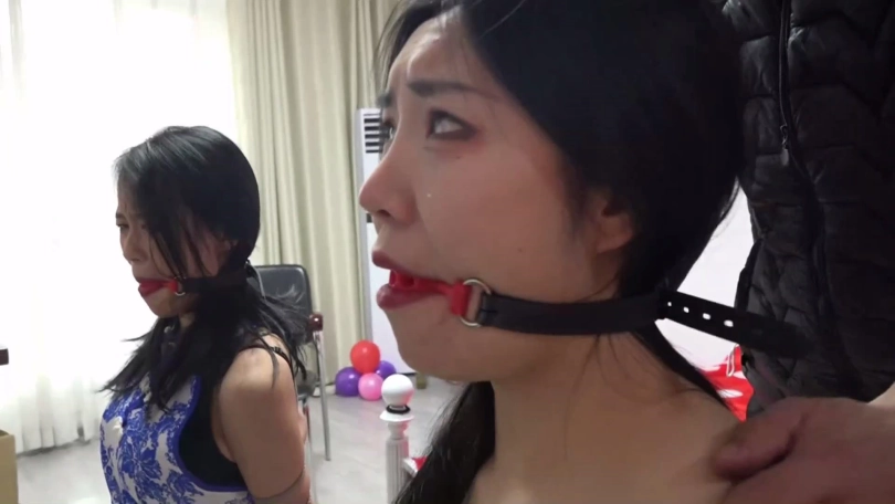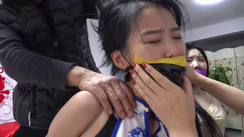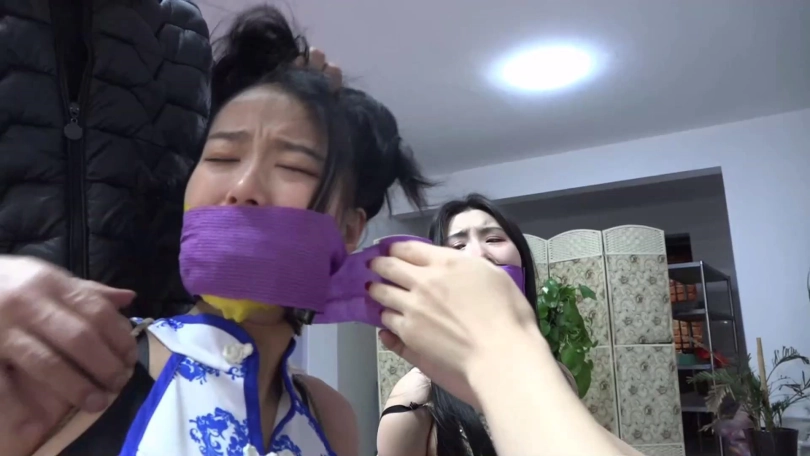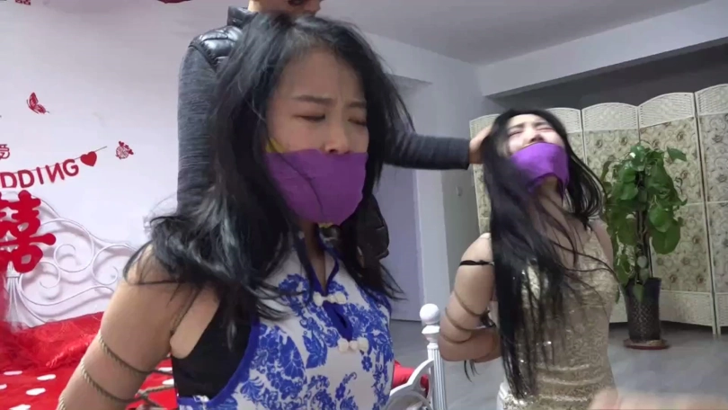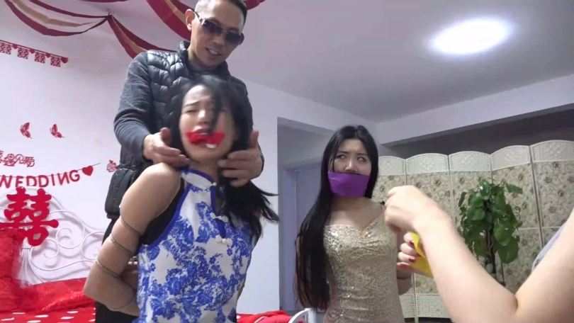 剧情:柳洋在家遭遇穿金色连衣裙和黑色短丝袜的吴晗与穿青花色旗袍和肉色短丝袜的家欣两名女劫匪捆堵打劫,苦苦挣扎后被出差提前回家的老公锁哥解救,得知吴晗家欣二女在家中卧室休息后,柳洋和老公锁哥遂一起过去将二女捆绑,给她们口中带上塞口球。