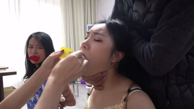 为了报复二女此前对自己的折磨羞辱,柳洋找来自己穿过没洗的两条原味脏内裤,将红色内裤塞入家欣口中,粉色内裤塞入吴晗口中,令二女痛苦万分。
