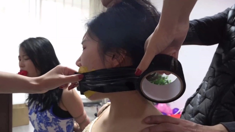 随后柳洋锁哥用黄色宽胶布分别剪下5张封在二女嘴外,用黑色胶带和紫色弹力自粘绷带分别在二女嘴外缠绕5圈,将他们嘴封得严严实实。