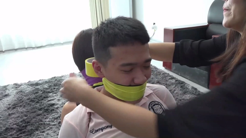 李然用手机给情侣二人拍照,还故意拿给他们看进行羞辱,愤怒的情侣二人瞪向李然这个可恶的坏女人,李然一看,还敢瞪我,把你们眼睛封起来,于是她拿黄色胶带和紫色自粘绷带缠绕在情侣二人眼睛外,之后带着抢来的财物笑着扬长而去,留下情侣二人扭动身体在黑暗中呜呜呜闷哼挣扎着,可不管如何挣扎绳索都纹丝未动,最终小两口低下头减小挣扎幅度呜呜闷哼喘息着,保存体力等待救援。
