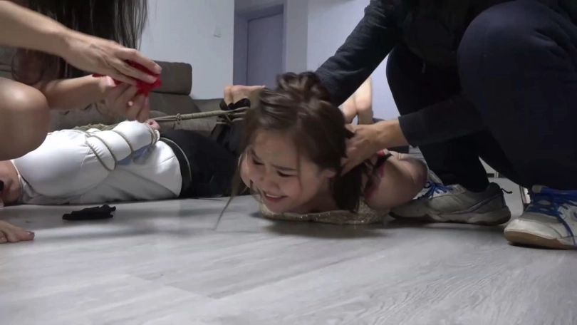 猝不及防的情侣二人被李然锁哥袭击捆绑结实,嘴里还被塞口球塞住。考虑到二人不老实,李然为了给他们点颜色看看,脱掉韩经洁男友脚上穿的两只原味臭烘烘的锦纶丝袜,分别塞到韩经洁和她男友嘴里,令二人恶心痛苦。