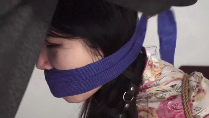 片段7:模特吴晗被一双黑色连裤丝袜塞满嘴,嘴外被蓝色自粘绷带缠绕封住。