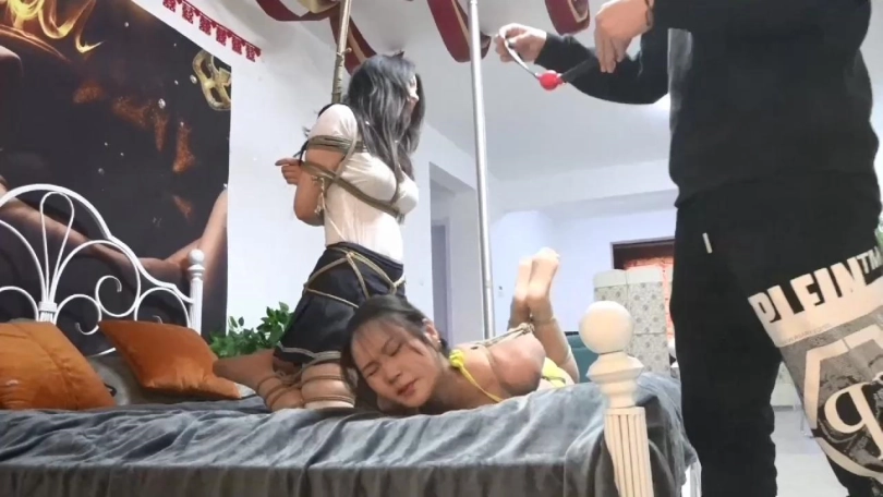 田甜和少女被富二代绑了起来(田甜认为自己无法还清,想离开,被富二代拦下,强行捆绑),不断得折磨。