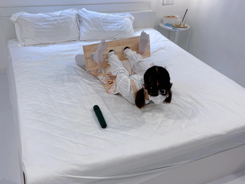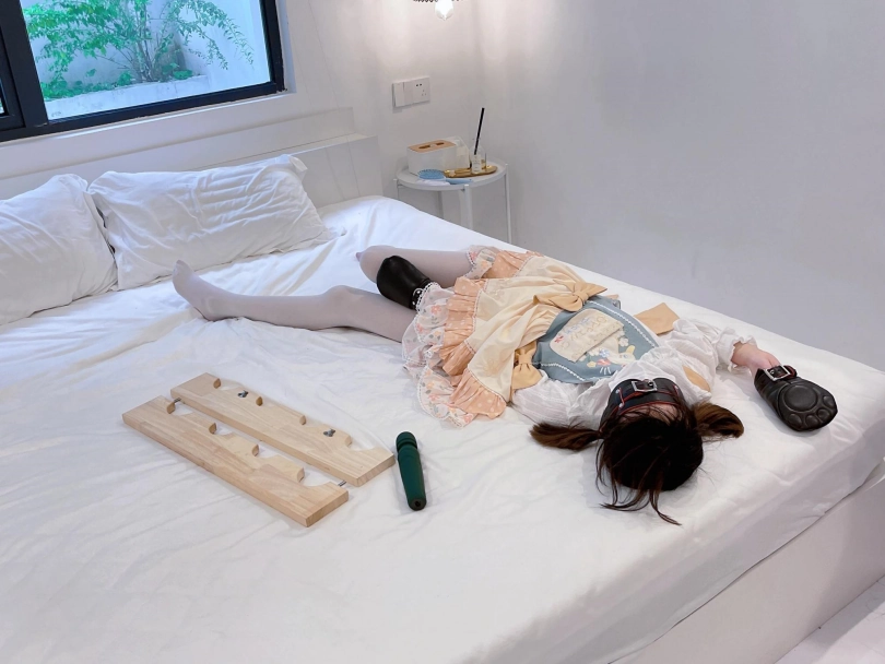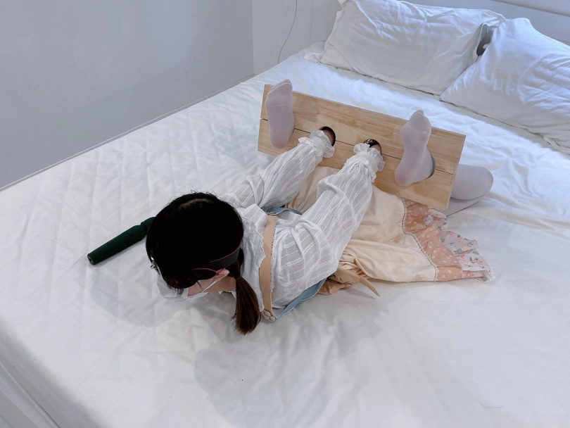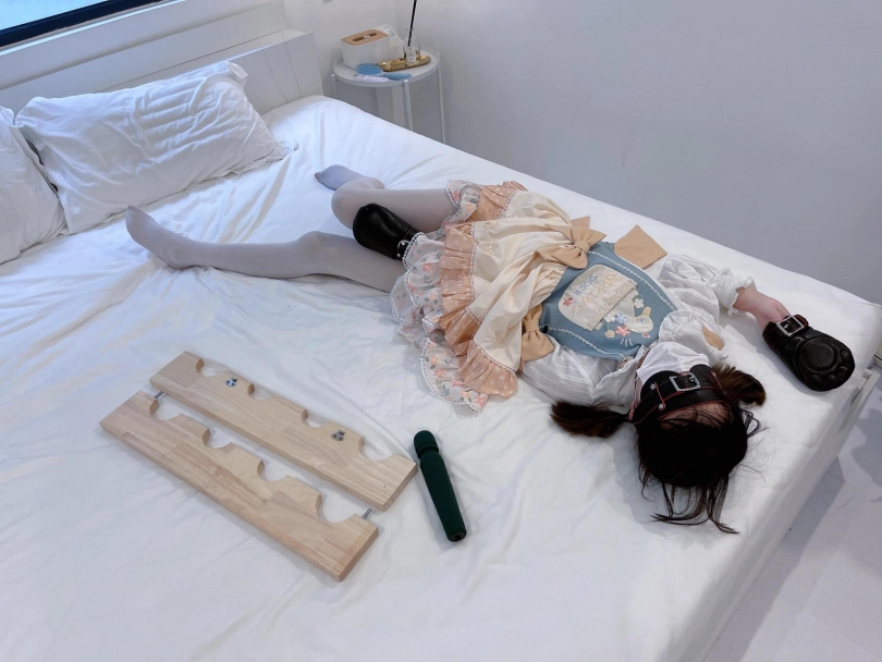 首先给茶茶带上狗狗掌套拘束手指,然后用木枷给茶茶手脚反铐成驷马的姿势——这个木枷很硬,设计出来是为了把手脚铐在前面的,想驷马铐就要硬掰身体,身体也必须被迫后仰做到“两头起驷马”才能成功锁上,痛苦程度不言而喻。茶茶的手腕在隔着手掌套拘束的情况下都被磨破了,可见全身要承受多大的压力..........
