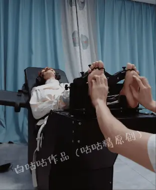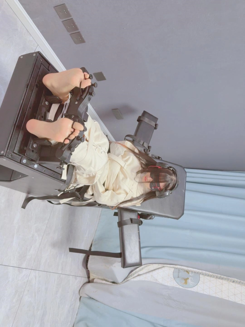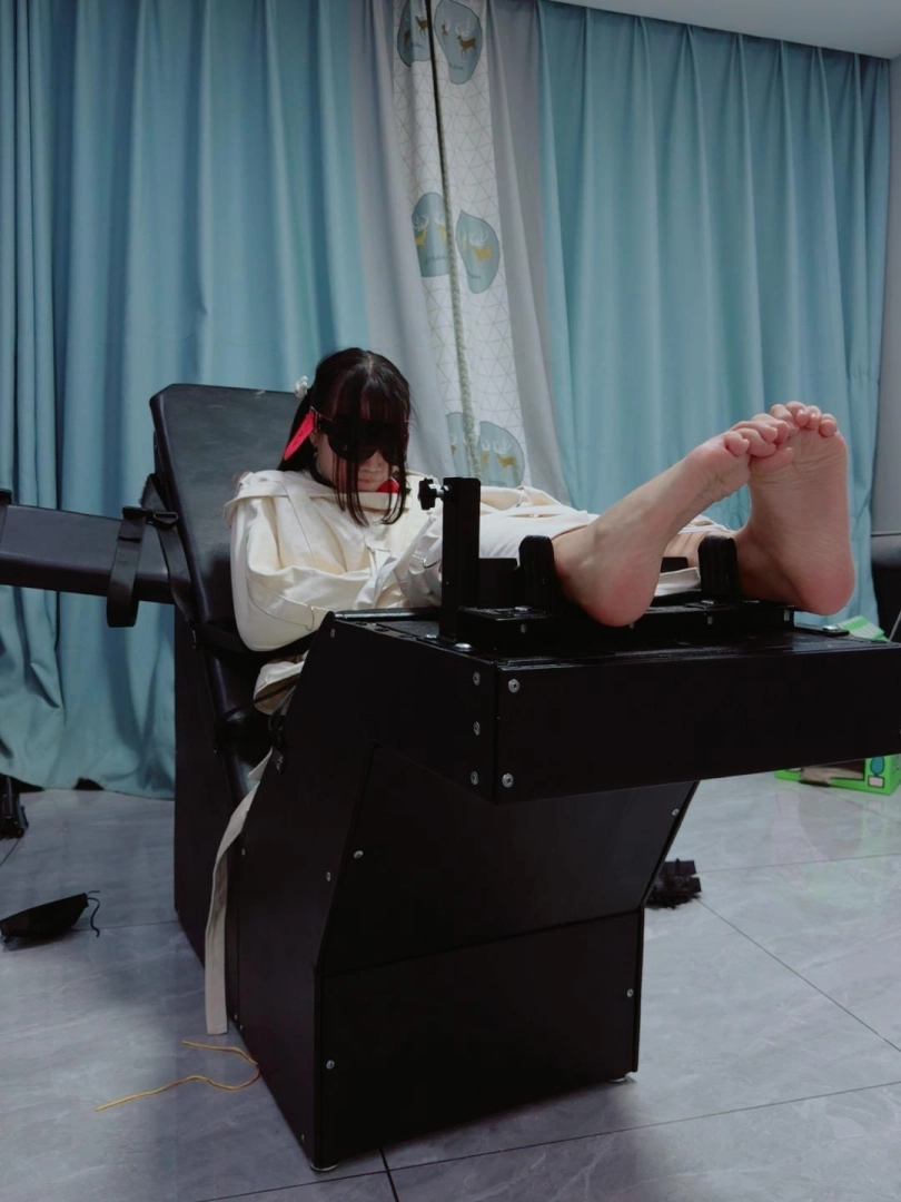 拘束:全套帆布拘束衣+拘束束腿,只露出脚底,然后把糖糖固定在刑床上,锁上重足枷,用束缚带加固固定在重刑床上。足枷固定脚趾,整个脚底被迫顶起来,一丁点都动弹不得。