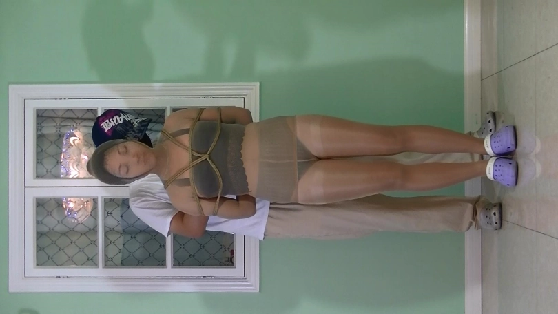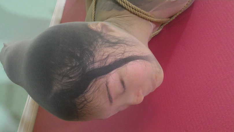 妹子被丝袜全包后,捆绑 放置 挣扎。近距离脸部特写拍摄。