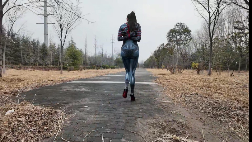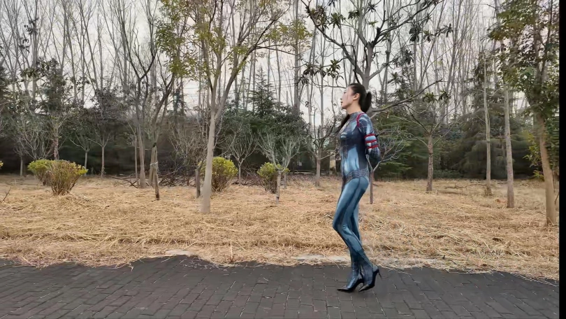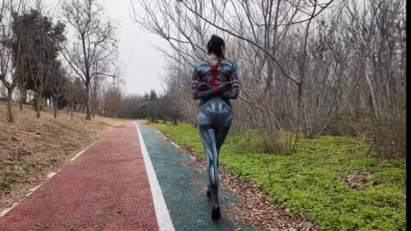 佳佳女蜘蛛装扮,户外散步行走,第一次拍户外题材,佳佳和我内心还是非常紧张的,找了个绿化带,冬天的户外还是很冷的,佳佳非常敬业,五花大绑,不愧之前做过模特队长,走路还是标准的模特步,身段更显优美