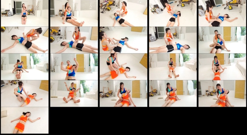 Suki (Orange) and Julie knock each other out cold and limp play each other arm and belly.