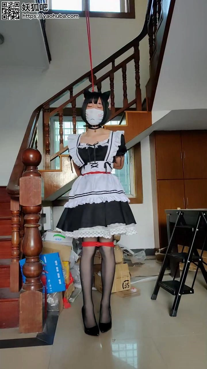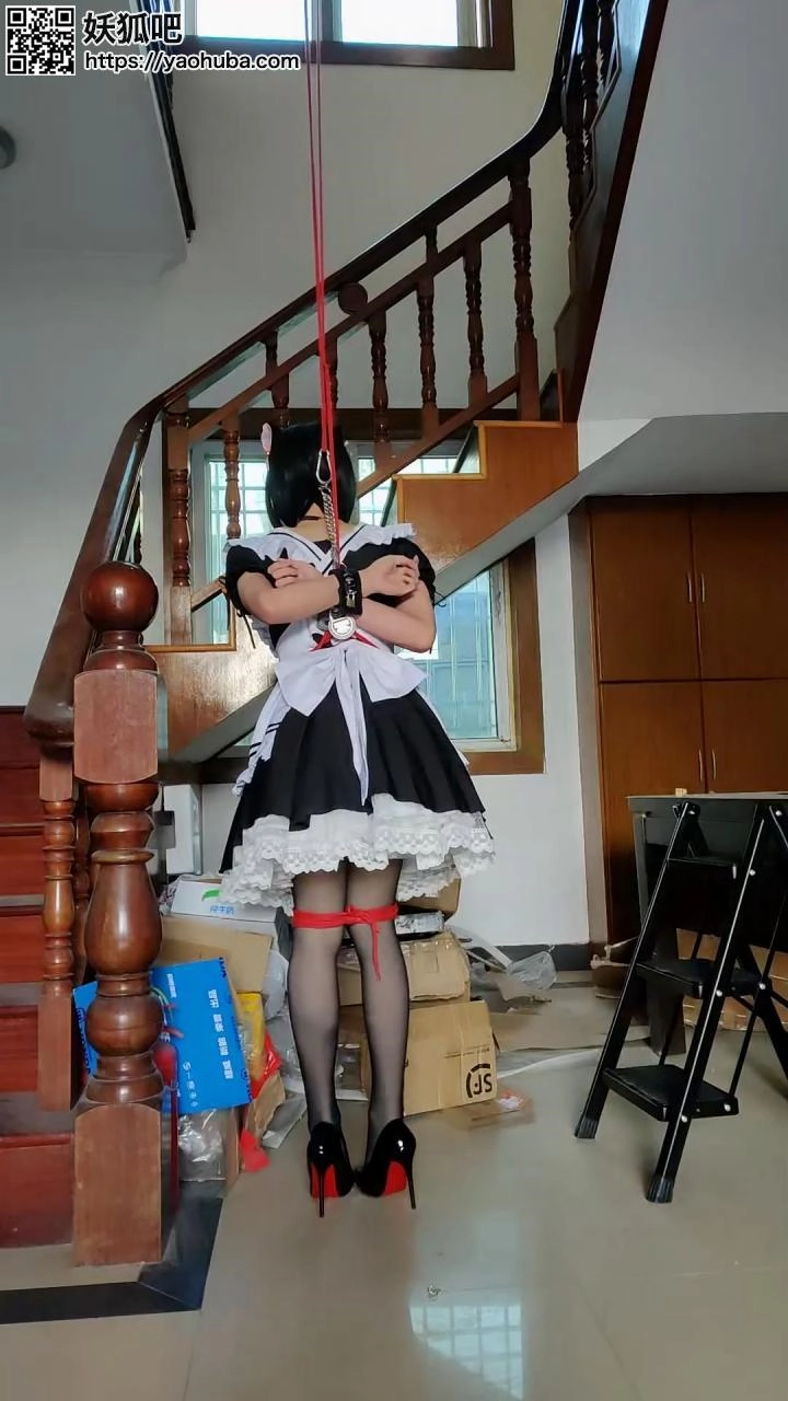 算是纯捆绑挣扎吧,前后有吊起和解脱的过程,最后解脱的时候出了点小意外,定时锁已经解开了,但是因为双手在背后吊得太高,居然没办法直接用手把手铐打开……还好垫脚的梯子还能够到,不然可就惨了……