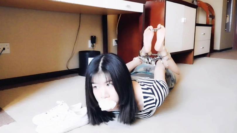 妹子刚回来,看到了桌上的字条,有一个镣铐寻找游戏,找到哪些就把他们锁在身上。妹子觉得很好玩,决定参与。妹子找镣铐,先找到一把链铐,锁在脚腕上。然后找到一个链子脚趾铐,脱下鞋袜,锁在脚趾上。妹子慢慢行走,找到一个脚趾铐,锁在了脚上。妹子最后找到一个三通、手铐、长脚镣,决定玩个刺激的,在地板上驷马镣铐。袜子堵嘴,鞋放在头边上。趴在地板上,长脚镣拴住一只脚,手铐锁住手,三通锁上脚和连接手。妹子很享受整个过程,很开心。妹子觉得有点难受了,却怎么挣扎也弄不开,着急了,要哭了。