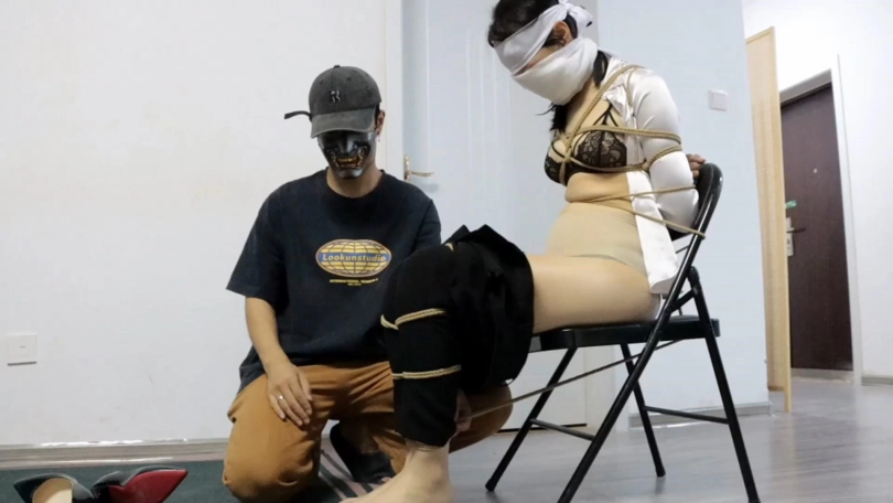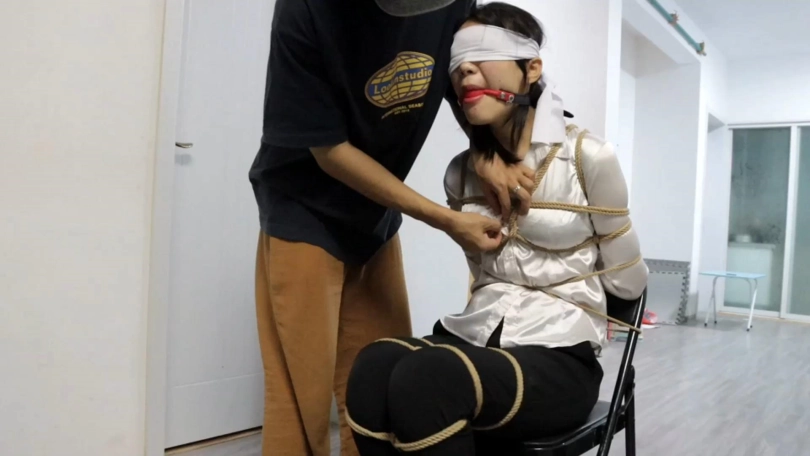 画面一转,小妤已经被K绑到了椅子上,上身被绑在椅背上,双腿双脚紧并在一起被严密绑住,双脚的绳结与手腕的绳结连接绑在一起。昏迷着的她,脑袋低垂着,嘴巴被塞进一个口球,眼睛被蒙住。她的外套被扒下,上身只剩一件白色衬衣。