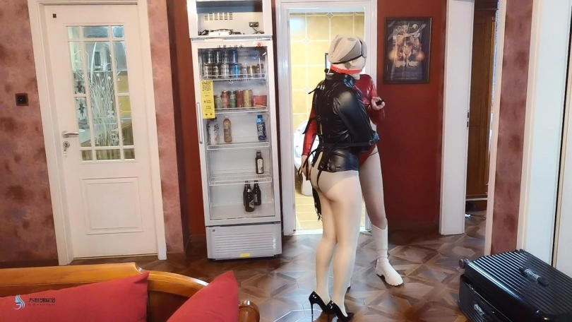 但女贼并没有停下的打算,她放开了女主,并给她穿上了一件拘束衣,眼睛被蒙着,嘴巴塞进一只口球。女贼再次用快乐棒和脚不断刺激摩擦着女主的下面。女贼牵着她在房间里来回走,并一边抽打着她。并再次将女主牵回房间床上。就在女贼想进项下一轮游戏时。一名蒙面男人闯了进来走后面抱住女贼,并将她迷晕。