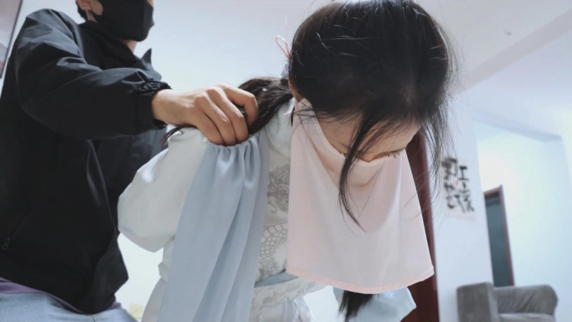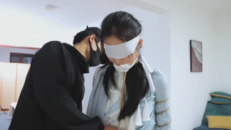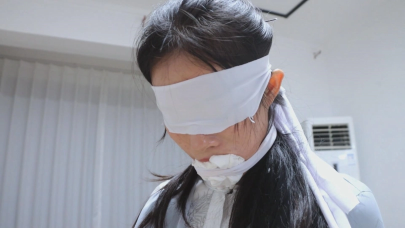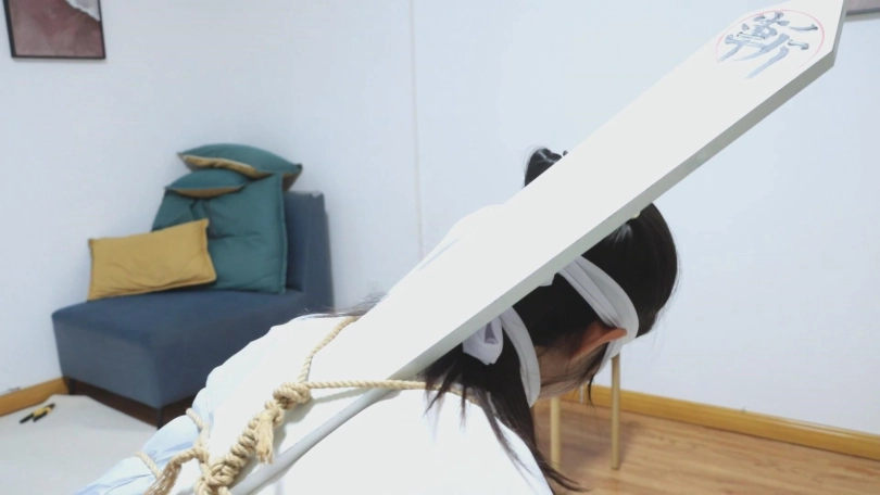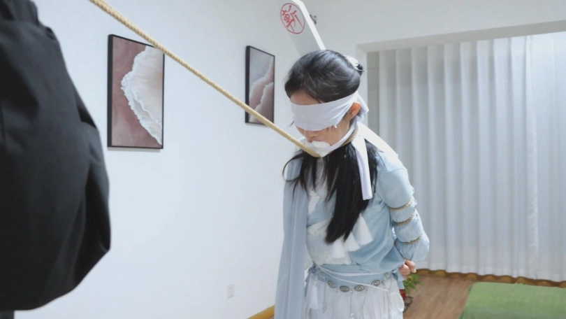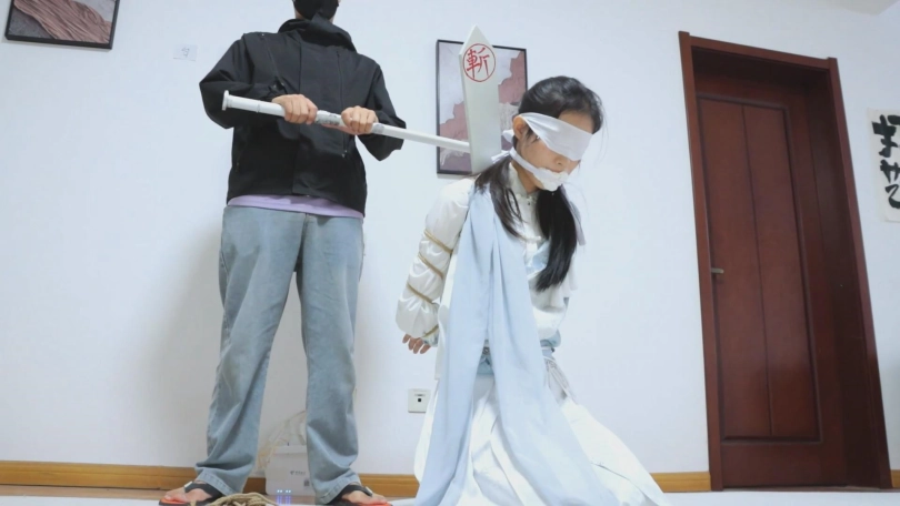 将她绑好后将她双手吊高,用白布蒙上双眼,摘了她的面纱,再背后插上亡命牌,果然,女侠的口中还塞着白布袜呢,怪不得有口难言。