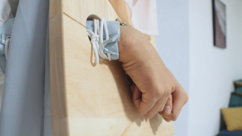 被去掉木枷后,女侠娇弱的宛如弱柳扶风般,可衙内并未怜香惜玉,抓着女侠的胳膊暗自用力一折,女侠手臂被折断,挺胸抬头透过堵嘴长长的呜了一声,另一只手也是如此,女侠的两只手就像无骨了一般无力的垂下,女侠仅能拼命摇头。