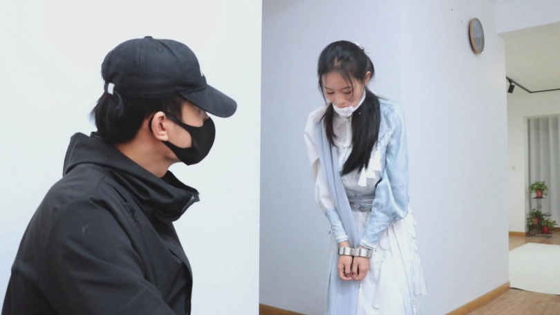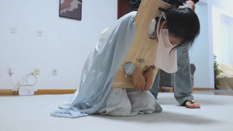 女侠带着木枷和脚镣,仍然戴着面纱,但似乎只能闻见细微的呜呜声,似是被什么东西堵住了嘴无法言语,被迫跪在公堂之上。