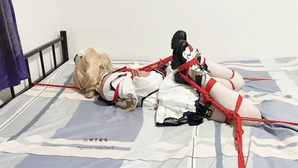这是一期放置,但是床上驷马固定!角色是芭芭拉,上身日式,双腿折腿驷马但是捆法略有差异,然后将双腿分别拉向两个床脚,同时脖子戴上项圈、拉向床头,从三个方向拉紧,完全消除动弹的可能。然后戴上眼罩、装上训练器、在双脚脚底和大腿根部贴上郊狼贴片,关上房门,只留下芭芭拉独自在床上做着毫无意义的挣扎……