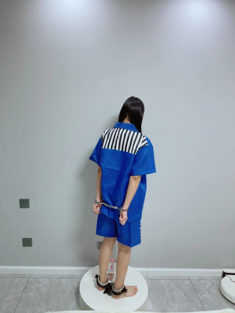 首先给糖糖戴上最严厉的板铐,反铐在身后,然后给糖糖戴上女死囚级别的重型脚镣(10斤),期间糖糖略有不满,作为惩罚又加了一副重镣!