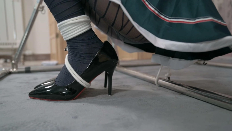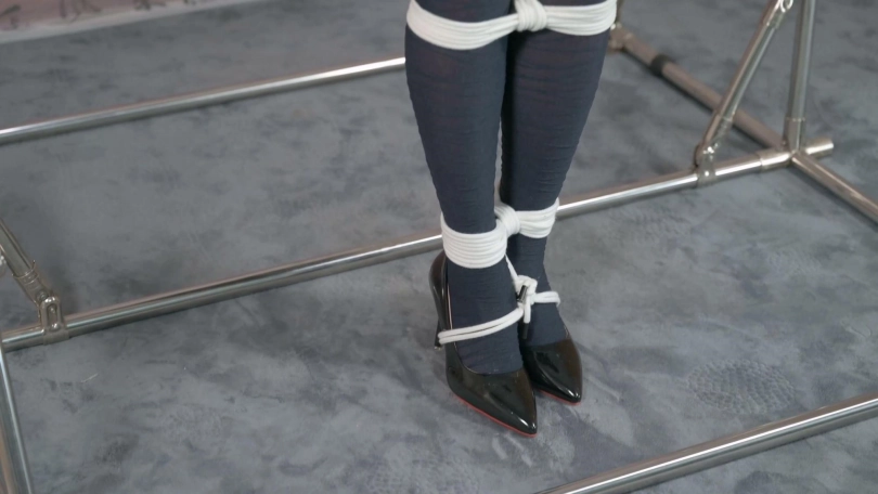 妹子穿上丝袜高跟显得格外修长,先是蹲姿直臂跨过一根横杆固定,然后TK教育,然后换坐姿,便于爱抚长腿,最后的电击让她尖叫连连。
