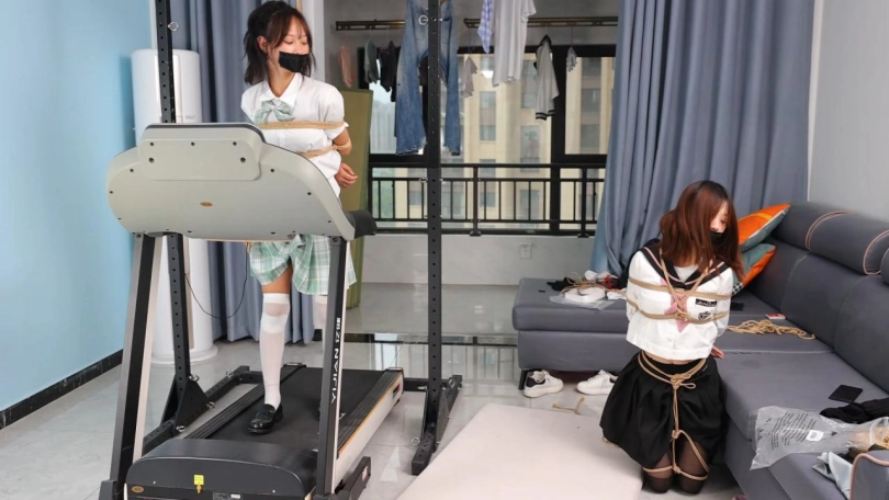 欢欢被坏蛋入室劫持,日式吊起,又用股绳连接着跑步机只能无奈的在跑步机上面跟着走。结果劫匪在屋子里什么都没有找到。气愤之下让欢欢想办法忽悠来她的闺蜜文文。文文一无所知的来到欢欢这里,结果立马中了劫匪的招数,被驷马拘束在地上,劫匪拿了文文的财务扬长而去。留下欢欢和文文在屋子里想办法解脱。文文想尽办法终于解开了连接脚踝和手腕的绳子。