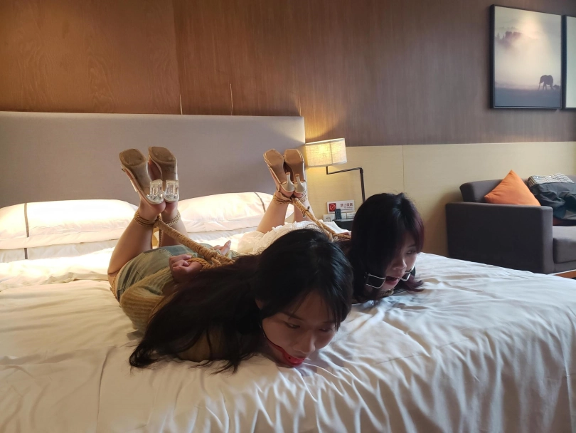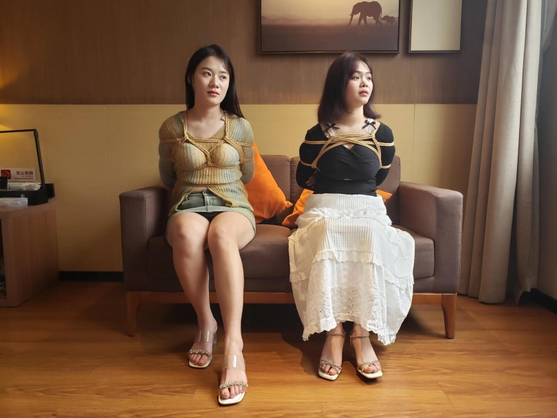小月带着闺蜜一起来体验绳艺,过来之前没有跟闺蜜说要被绑起来,闺蜜刚进门看到绳子就懵了还有点慌,被绑起来还经常用方言吐槽。哈哈!说要把她们绑驷马,她们一脸懵,再戴上口球两个妹子有点反感,绑上之后还把脚指头用扎带扎起来了,用牙刷挠了下脚底。