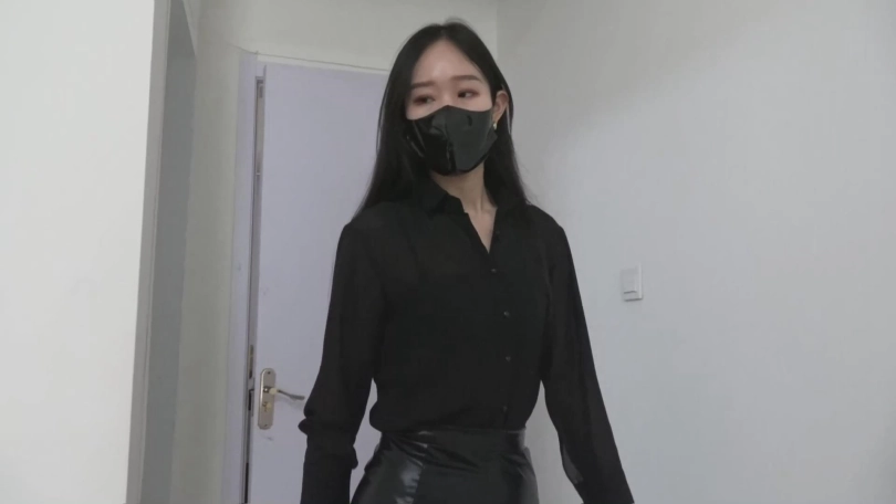 上身干练的黑色紧身衬衣,搭配超短包臀皮裙,修长的双腿包裹着黑丝和高跟袜靴,