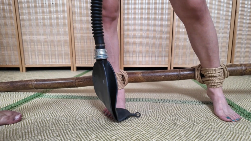 双手举过头顶束缚,双脚分开绑在竹竿上