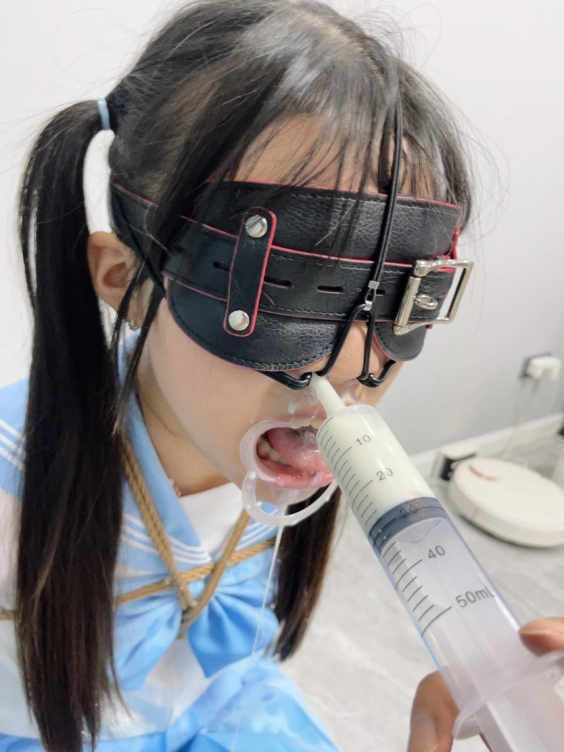 用鼻饲针筒抽出牛奶,塞入妹子的鼻孔里,用最大力气按压针筒,让牛奶喷射进妹子的鼻孔,从口腔流出。