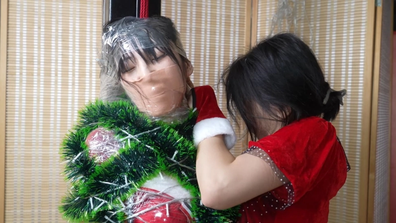 穿着圣诞服装的小0和嗷嗷本想一起共度佳节,却不知为什么分别被紧缚捆绑起来,嘴巴和鼻子都被胶布封住,十分难受。被绑着的她们试图协作脱缚,换来的却只是紧密的连缚,还被戴上项圈用链子栓在一起。一番挣扎后,她们精疲力尽,晕了过去。