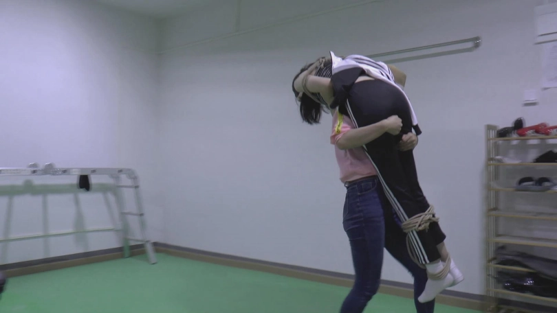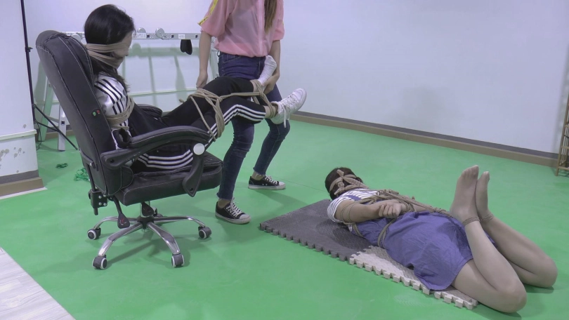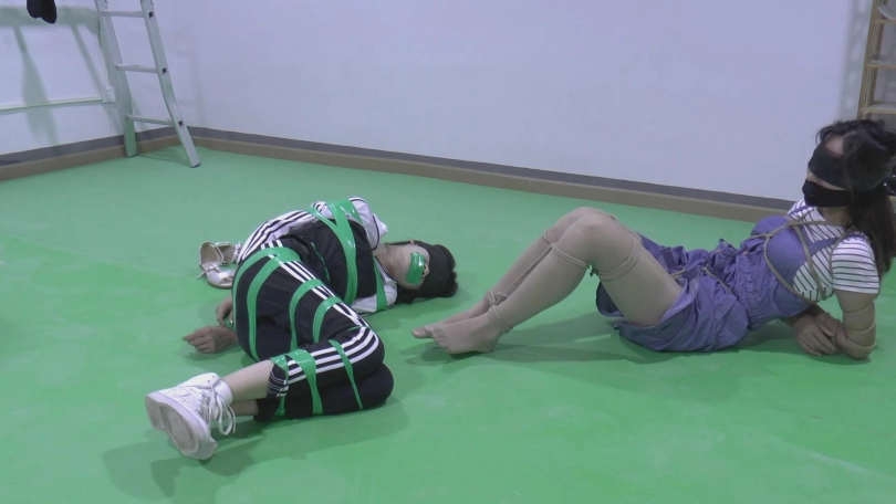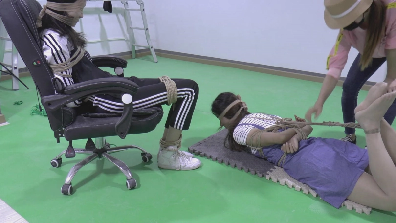 再醒过来,发现小雨被绳子绑在了椅子上,嘴里被勒着丝袜,而小文则被绿色胶带用驷马的方式绑在了地上,鼻