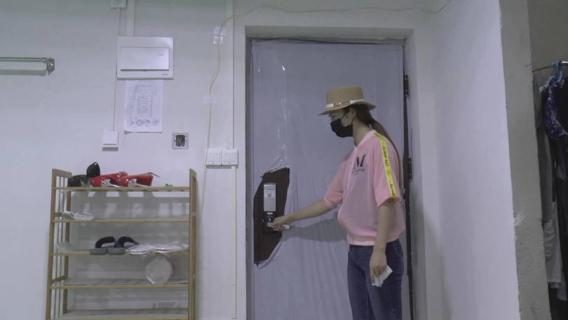小雨和小文往门口挪动着,挪到门口小雨努力站了起来,打算开门,但是没打开。