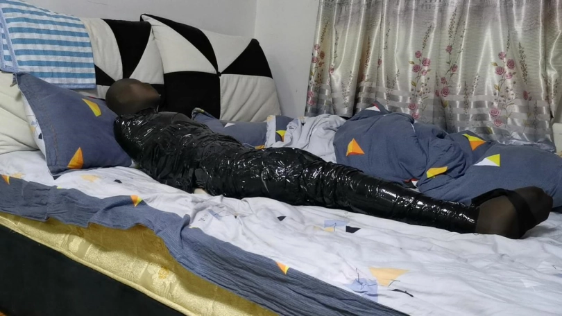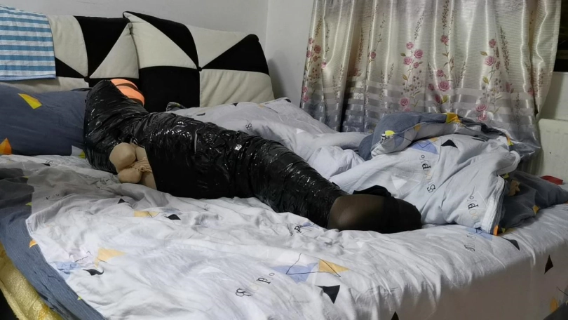 先套上了一层丝袜,然后用胶带缠绕成木乃伊,丝袜套头,绷带封嘴蒙眼,TK,吻足 无奈的挣扎。