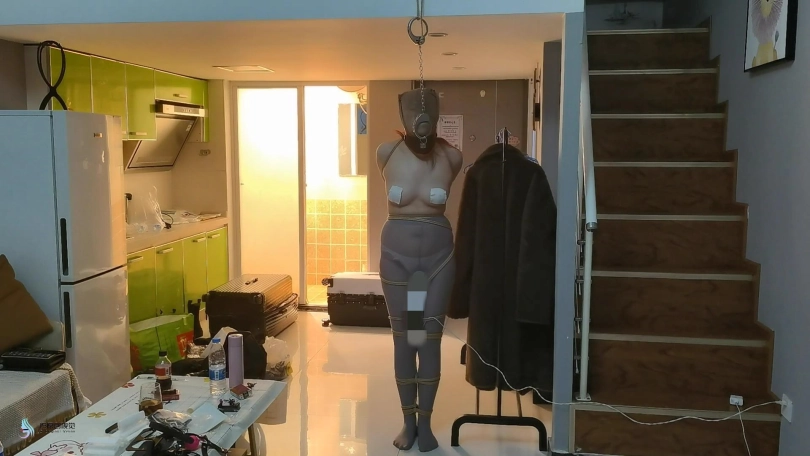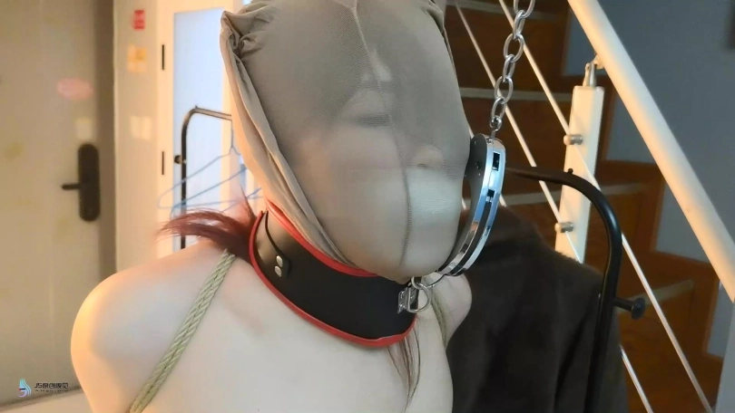 外面用绷带缠绕。头上套着一双丝袜,脖子上戴上脖套,并和楼上的栏杆连接在一起。胸部夹着乳夹,下面用治疗棒不断刺激着女孩。很快女孩就达到顶峰。经过一些列的治疗,女孩终于康复。。。