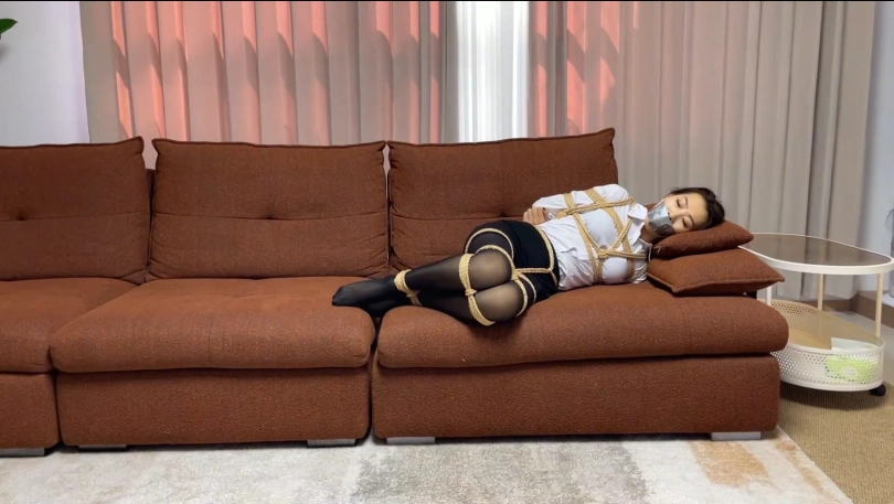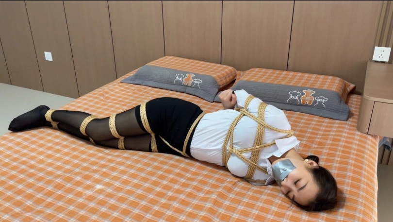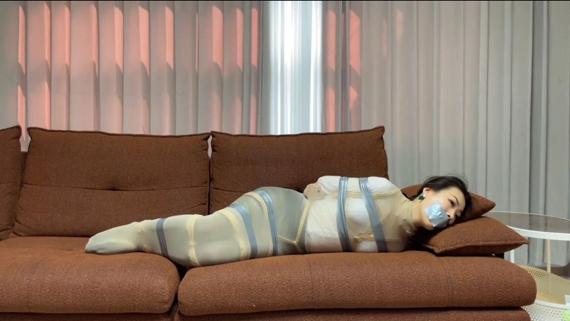 再次醒来,发现自己被丝袜全包裹了,并且在丝袜外面还缠了几圈胶带。