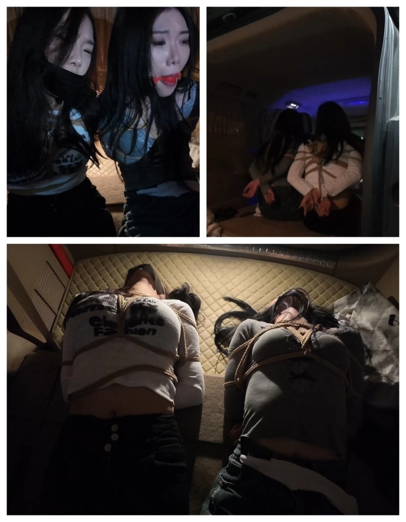 剧接上回,芷溪身着瑜伽服,瑜伽裤,白棉袜被直臂紧缚驷马倒攒蹄捆绑在房间中,嘴巴被严密封堵使她无法呼喊,驷马倒攒蹄使她只能扭动着身体朝门外逃跑,可这难于登天。门外的小偷取到了钱又叫来了一个绑匪同伙,想着从芷溪身上再捞一笔钱,二坏人进门,就看到挣扎的芷溪,于是将芷溪抬到了客厅,为了惩罚她的不老实对她进行拳打脚踢,威逼利诱,拍照侮辱。对芷溪一番折腾后,用到逼问出芷溪钱财的位置,并得知芷溪还有个有钱的姐姐,问到信息后,二人仍没有对芷溪怜香惜玉的意思,等待芷溪的是一个口球紧紧塞入芷溪的嘴里,接着再脑后紧紧扣住,芷溪吃疼却只能发出呜呜呜的声音。接着二人将芷溪挣扎录成视频,将视频发给芷溪姐姐,以此威胁芷溪姐姐(大雷)要赎金来救芷溪。可穷凶极恶的绑匪哪会只想拿赎金那么简单呢?二人商量一不做二不休,趁着交换赎金的机会,把大雷一起绑架了。一拍即合,二人给肉货芷溪换了套衣服,接着重新五花大绑手脚,然后为方便行动,二人将耳塞塞入芷溪耳朵里,然后用黑色胶带缠绕封住她的眼睛,再用白布蒙眼,这下芷溪就是听不见也看不见了,虽然二人一人摁住芷溪的头,一人用黑色头套把芷溪的头牢牢套上,把芷溪严严实实的进行了感官封闭,为了防止芷溪叫喊,二人又用红色口球堵塞了芷溪的口部,刚芷溪看不见,听不见,叫不了,动不了,成了一件人人随意摆布的肉货!二人将肉货(芷溪)抬上了MPV的后座,在车上也不能让芷溪放松一下,坏人脱了她的一只鞋子,用力挠她的脚心,听着芷溪被挠脚心而发出的呜呜呜呜呜声音好不享受。一会,到达交易地点,二人把芷溪关在后备箱,然后下车等候来交赎金的大雷,大雷来到了后提出了要先验货,于是二人打开后备箱,大雷看着车上五花大绑,黑头[X_X]头,红色口球堵嘴的少女,提出疑问:戴个黑头套,我怎么知道是不是我妹妹?绑匪说到:你自己上去把头套取下来就知道了。大雷上车取下了芷溪的黑头套,看到了就是自己的妹妹芷溪说了句:妹妹你受苦了。可一会,绑匪也上了后备箱并关上后备箱门,这下,大雷也一起受苦了。后备箱里,绑匪用到威逼大雷,让她不敢动弹,然后又用麻绳将她捆绑起来,捆绑结实后,用一只白色棉袜塞入大雷嘴里,然后用五张布基胶带将大雷嘴巴封上,这下大雷也是手脚不能动,嘴不能喊叫了。被控制并捆绑堵嘴后的二女成了两名猥琐绑匪的玩物,二绑匪玩弄二美女,挠脚心,挠腰,挠胸全都安排上了。二女也只能呜呜呜挣扎,玩累的二绑匪决定将二女运回关肉货的地方,于是发动车辆,出发。发车后,二女在后备箱挣扎并呜呜呜但也无济于事,只能等待命运的安排!