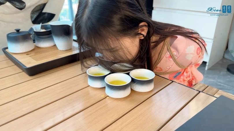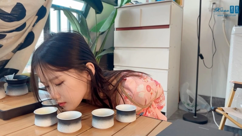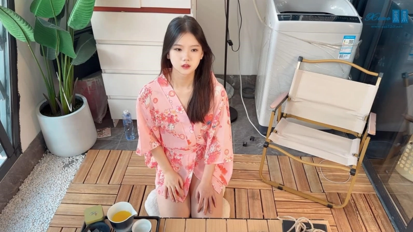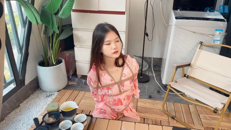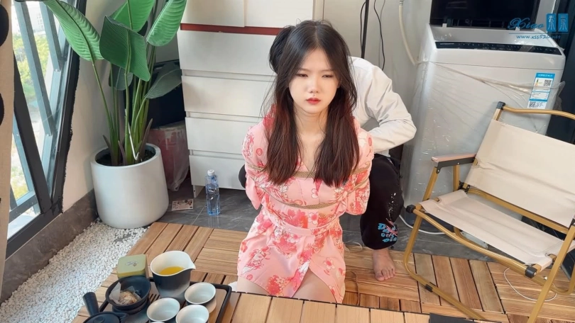 美女模特佳佳粉色和服绳艺品茶