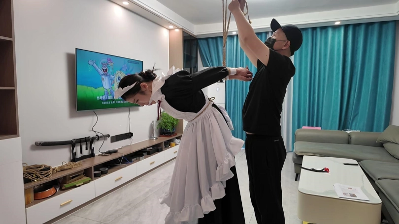 男子将绑架来的人妻装箱带走。回到家后开箱,经过一个月短暂的调教,佳佳暂时成为男子家中的女仆。不过这只桀骜不驯的小野猫似乎不太好训,于是男子借佳佳摔碎碗的契机,再次展开调教。他将佳佳绑好在客厅中,假装要离开。佳佳见机会难得,于是便努力挣扎,试图去到窗边呼救。就在佳佳快到窗边时,男子一把抓住佳佳,把她从希望的边缘一把拉了回去进一步调教。接着男子在客厅中吊起佳佳后手,给她戴上口球并且用绳子拉起口球带,强迫她抬起头,然后拉起裙子绑上股绳再扒开佳佳胸前的衣服,往两胸各塞入一颗[X_X]。只见佳佳被[X_X]刺激得口水直流站立不安,下身又被股绳勒住,只能不停地发出呜呜声祈求男子放过她。再往后,男子决心一步到位,接着将佳佳绑成个单腿吊缚,并且在下身加上个棒棒,两胸前的蛋也调至最高档,就这样,将佳佳调教至几近虚脱。最终,桀骜不驯的野猫终于被驯服,含住了象征屈辱和臣服的水晶柱,就这样佳佳调教成功,正式成为了男子家的奴隶女仆。开头的开箱环节是上回拍的时候让老哥顺便给拍的,开箱环节看得真爽。这回为了想看到的经典英伦风格女仆专门去按照佳佳的身材定了一件,白丝也换成稳重沉稳一点的,效果也是非常棒。全片一共三个段,因为时长和大小限制就先分成上下集了。老哥那拍摄的手法和认真程度真没的说,一如既往地敬业,我想看的就是这端庄典雅的女仆被一点点调教得下流,衣服从穿得整齐慢慢变成暴露又凌乱不堪,在这部里都给拍出来了。特别是佳佳这次化妆的妆容比第一集的效果还棒,挣扎的表演也是一如既往的卖力,第二段的时候戴上口球后口水流了满地。